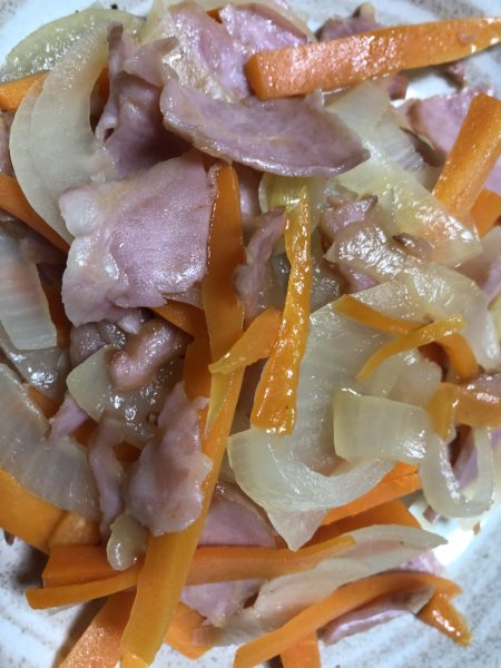 写真はベーコンと野菜のカリカリ炒めです。にんじんも良い味出していて美味しかったです。